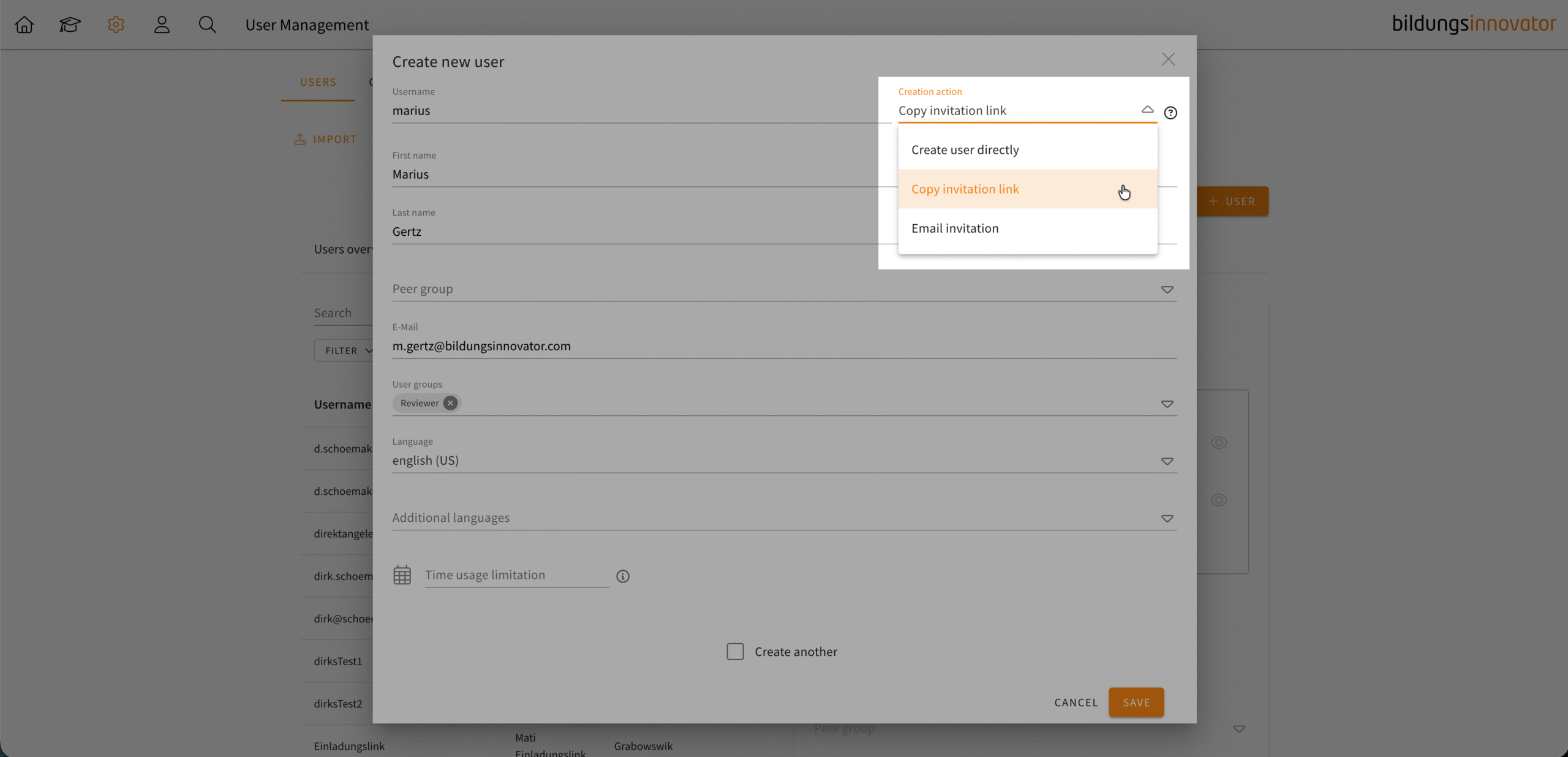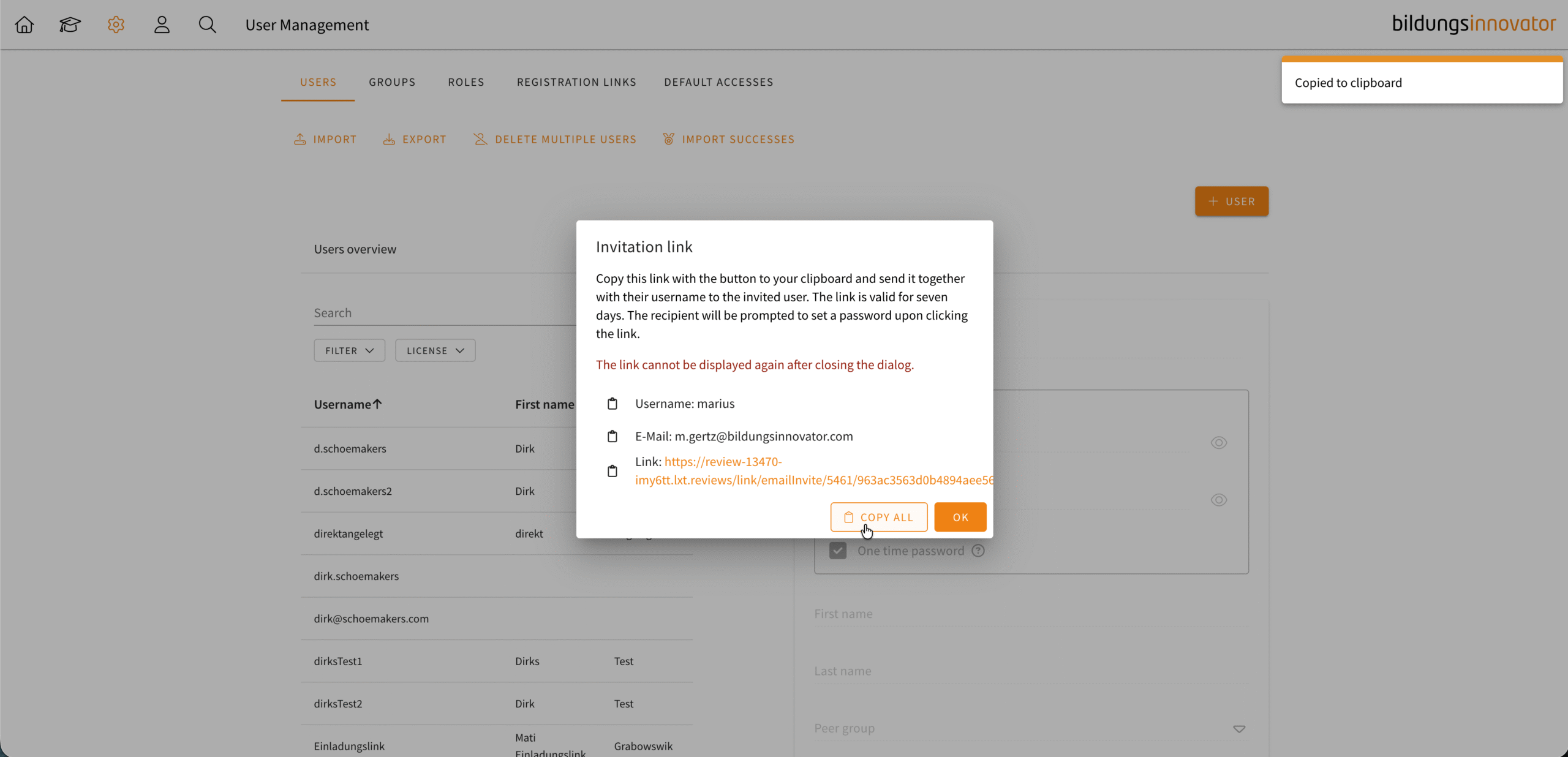 When creating a user, you can generate an invitation link instead of sending an automatic email. After creating a user, a dialogue box will appear containing the invitation link for you to copy. You can copy this into your own email programme and customise the email according to your needs. Important: This dialogue box cannot be reopened after creation. Similar to the automatic email invitation, if the user has not yet set a password, you can click on the user and send an automatic email with the link.