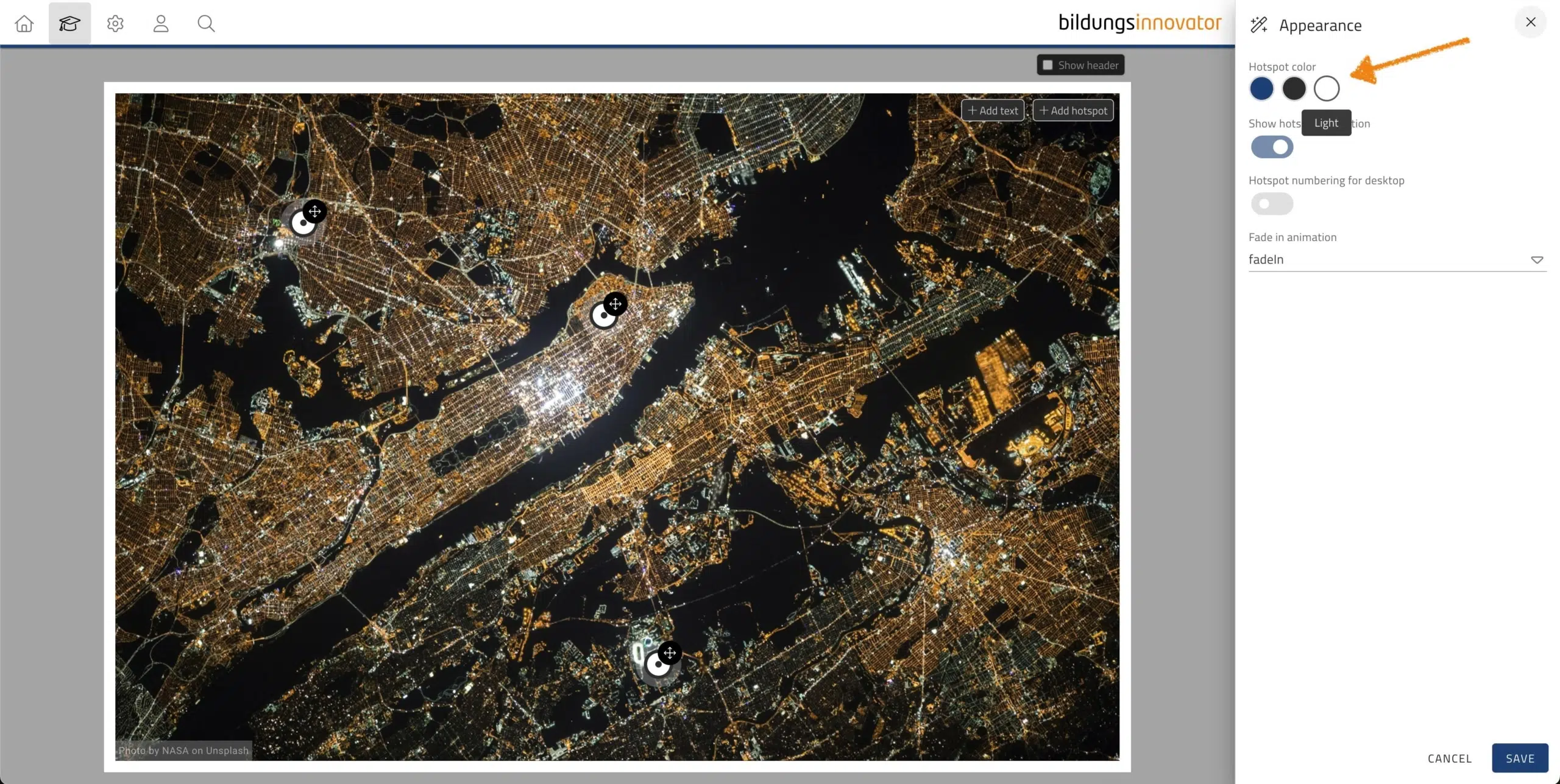 You can now change the color of the hotspots. In addition to the primary color (corporate design), you can choose between the colors light and dark. You will find the setting in the side menu as soon as you click on “Select element appearance”.