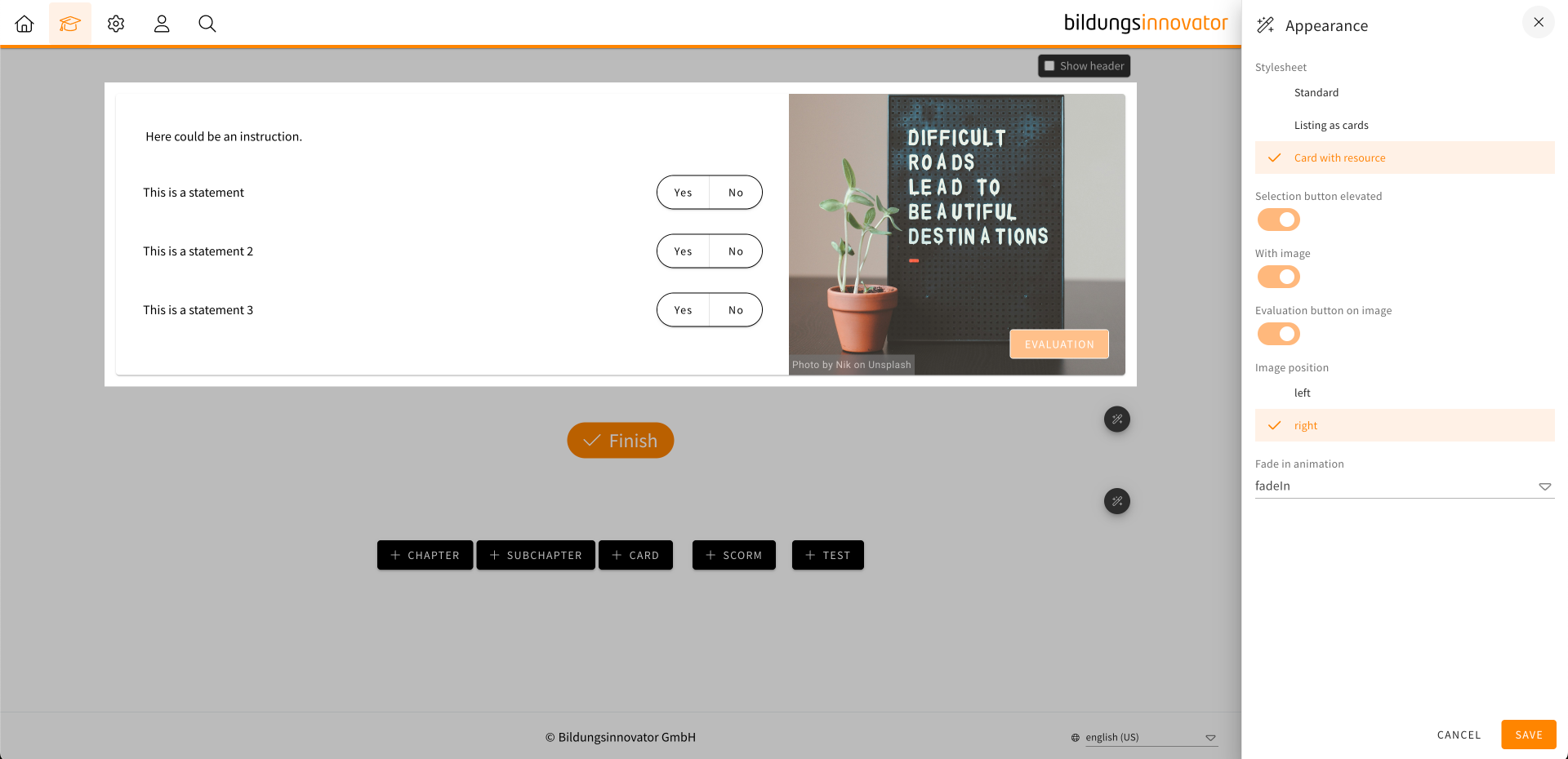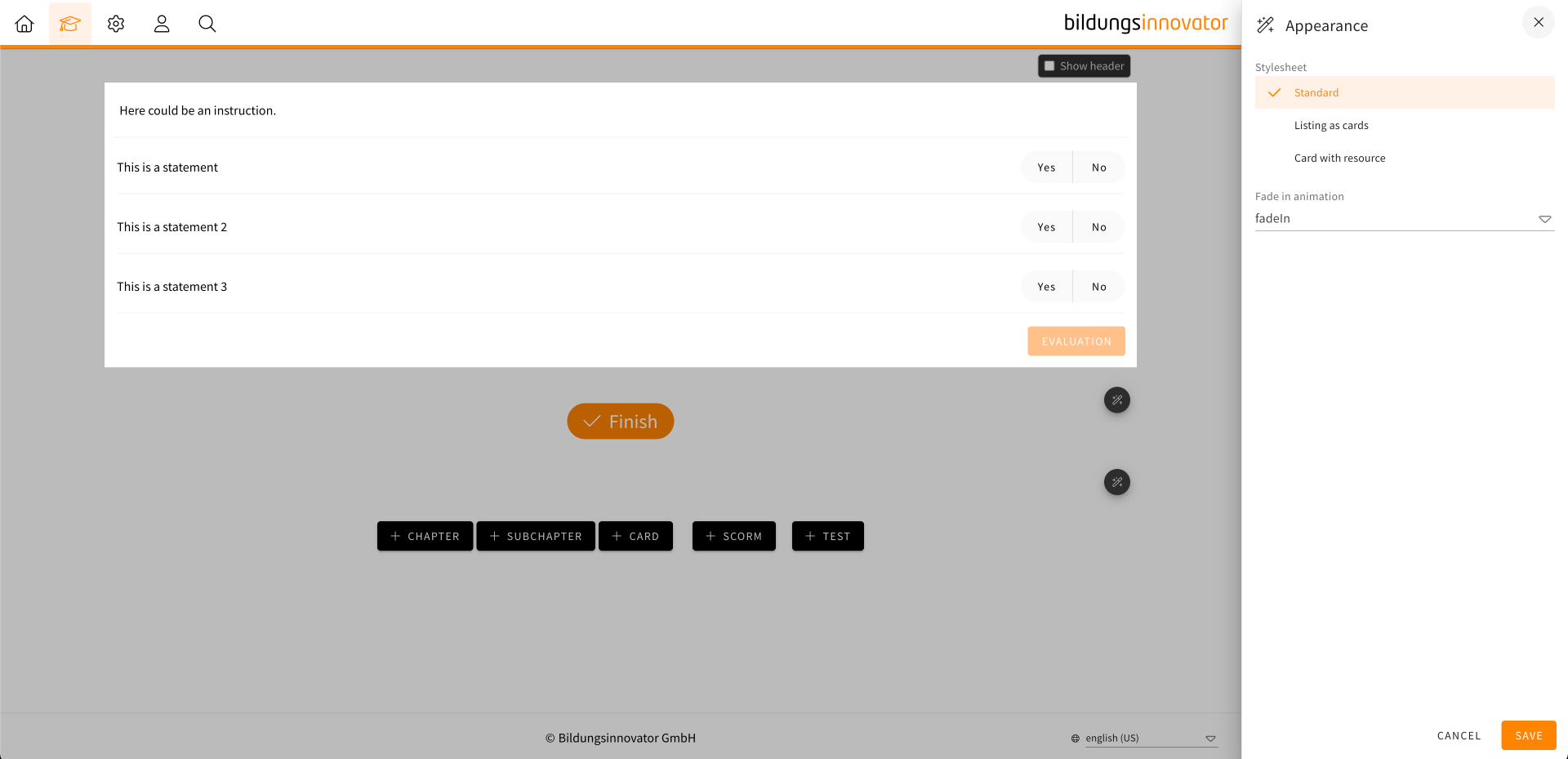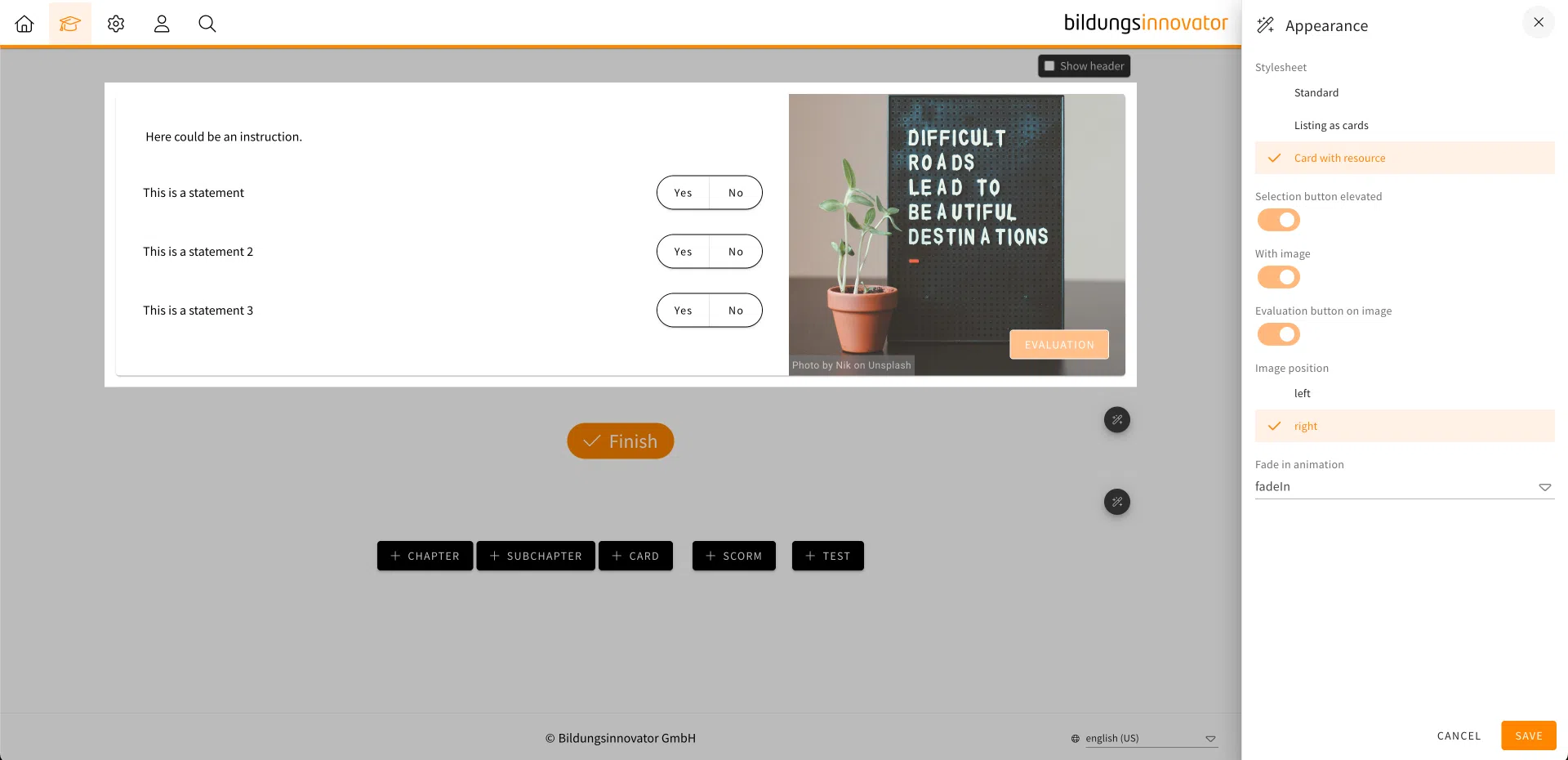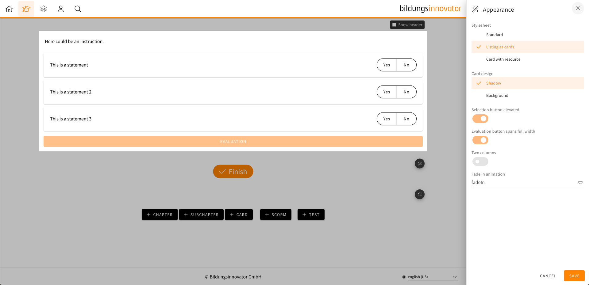 In the “Listing as cards” stylesheet, for example, you can format the “Evaluation” button to the width of the element. In the “Card with resource” stylesheet, for example, you can add images and position them on the left or right.