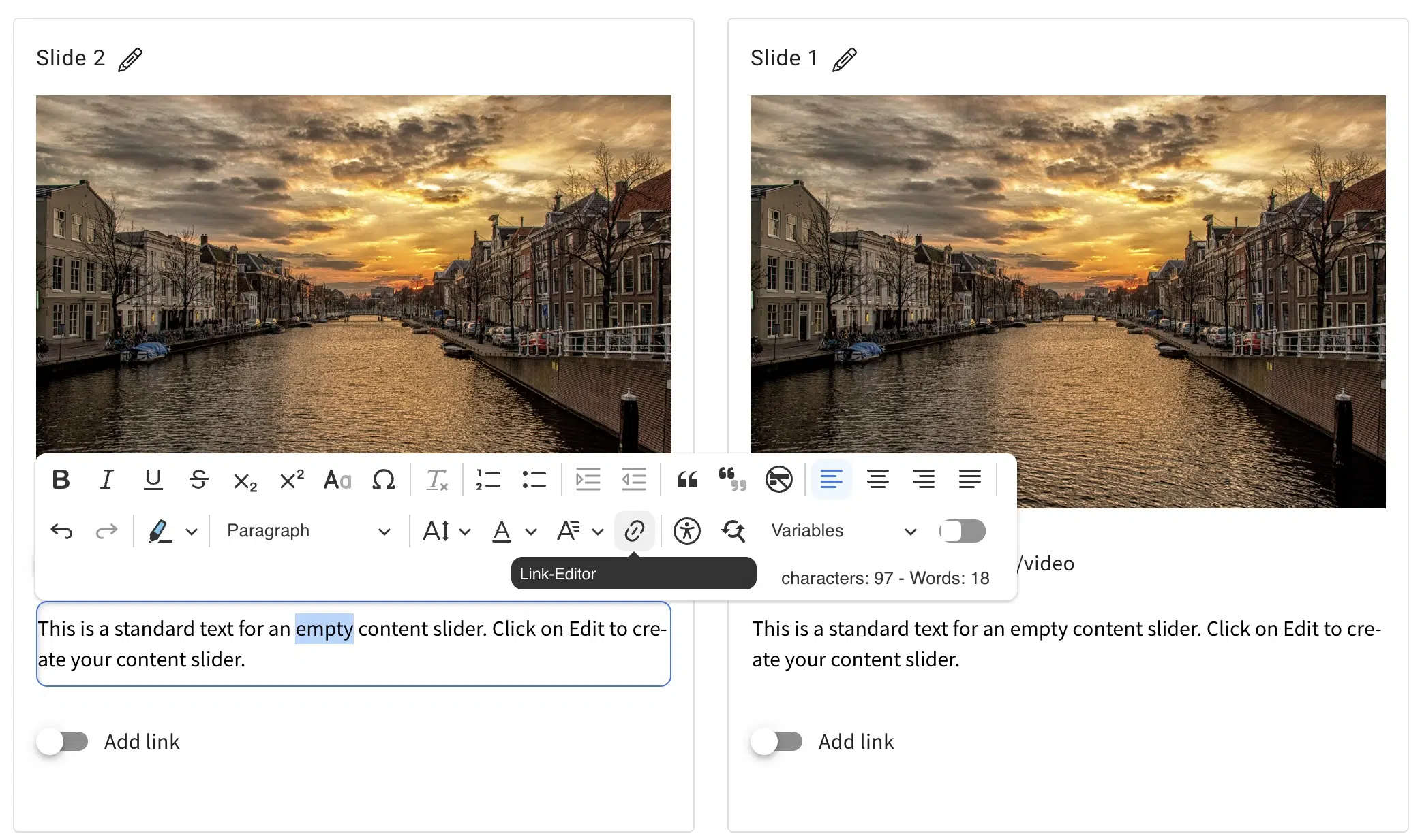 From now on you can set links in continuous text. Previously, this was only possible at the end of a slide/card/line. You set links in the continuous text in the same way as in the text editor.