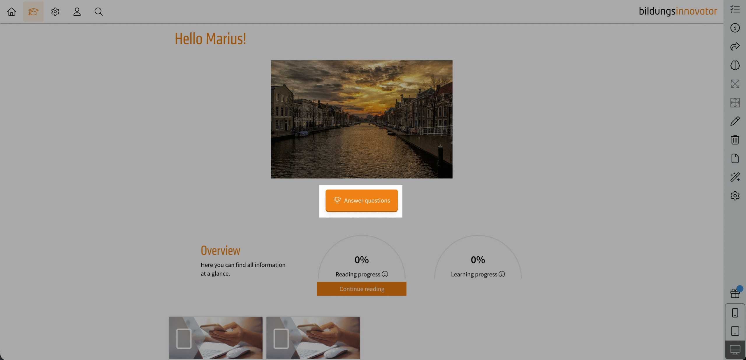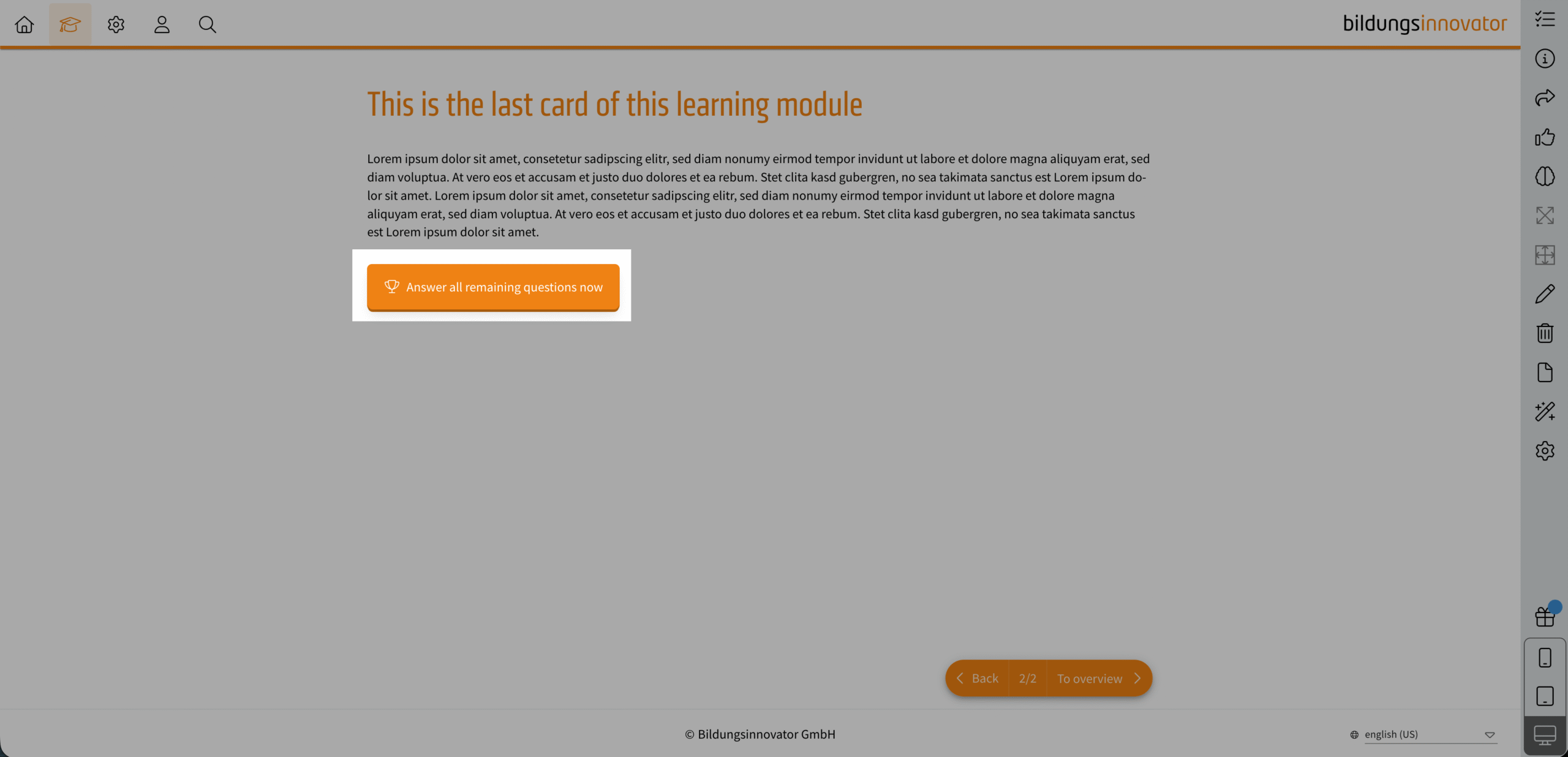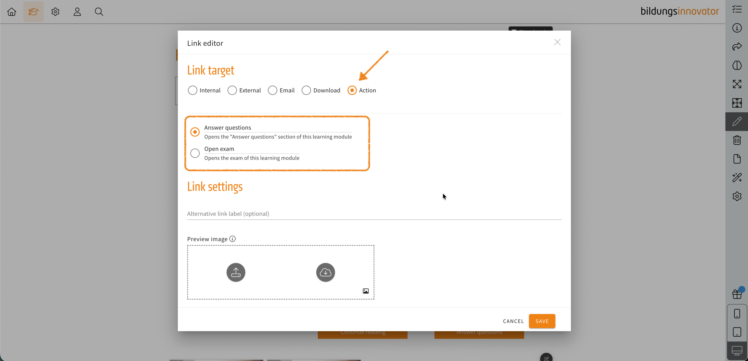 You can now create link elements of the type ‘Action’ in learning modules and cards. The familiar functions ‘Open test’ and ‘Answer questions’ are available as actions.