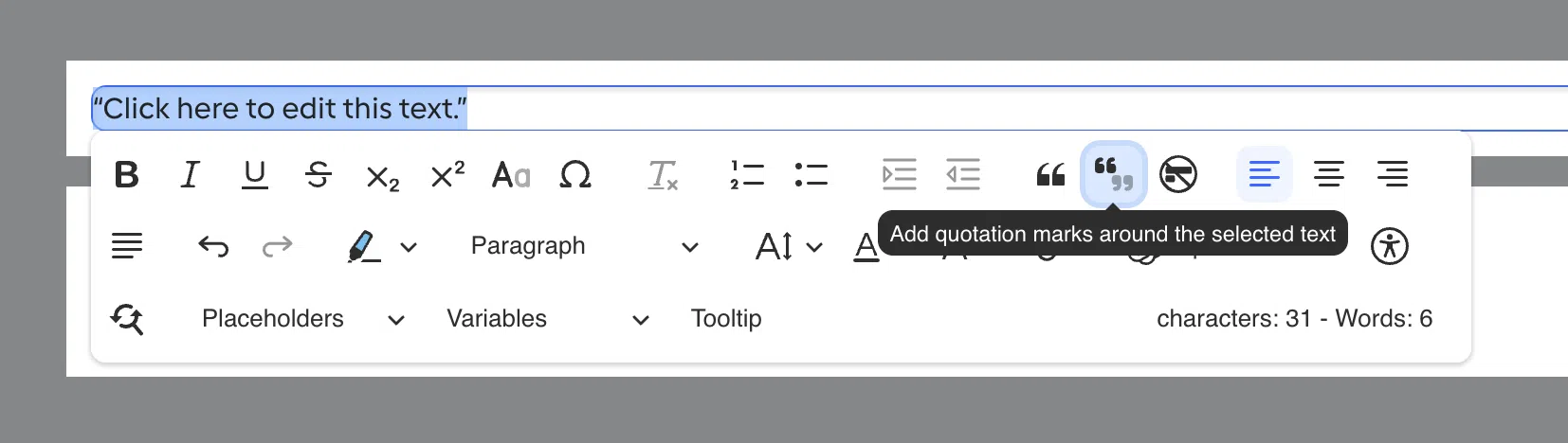 Now add quotation marks automatically. To do this, simply select the text and click on “Add quotation marks around the selected text” in the text editor.