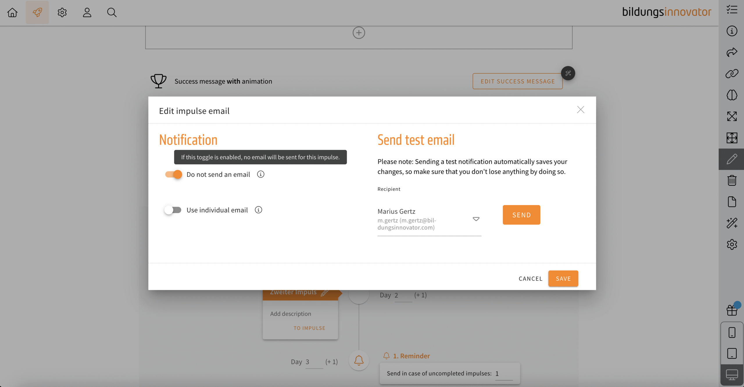 Decide now whether LXT should notify your learners by e-mail about a newly activated impulse or not. Decide individually for each impulse. You will find the option via the e-mail symbol on each impulse.