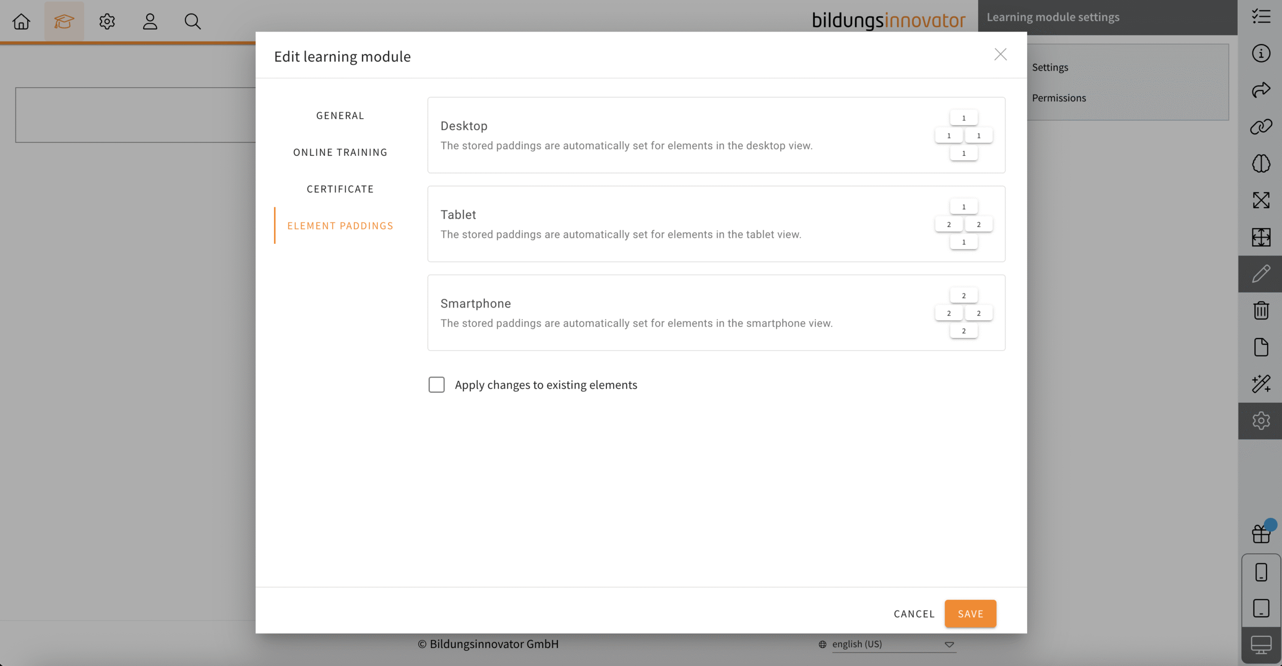 The default value for element spacing is 1, but it can sometimes be the case that a spacing of 2 makes more sense for tablets or smartphones. There is a new feature in the settings of learning modules to set this as the new default (for each viewport) and apply it to existing elements if necessary (checkbox).