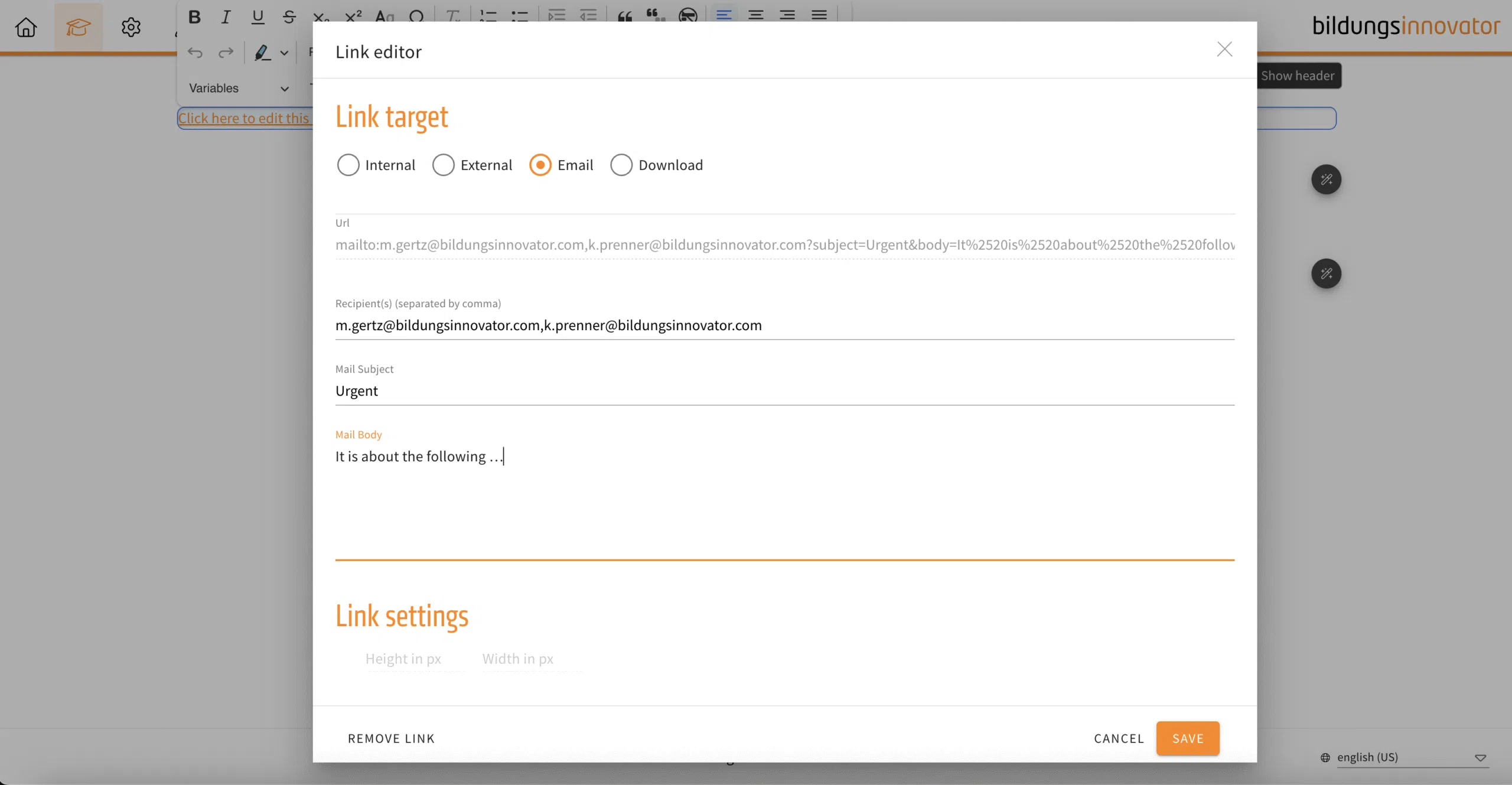 If you previously wanted to create a mail link, this was only possible via the external link. And here you had to know the syntax (mailto…). Now we have simplified this by creating a new link type explicitly for emails.