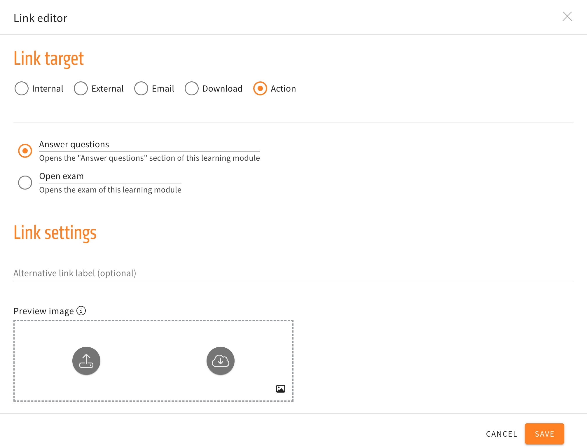 When creating and then editing a link element, the submenu for actions will no longer just have the options to directly open the “Answer questions” section or open the exam directly, but additionally have the three new navigation options mentioned above.