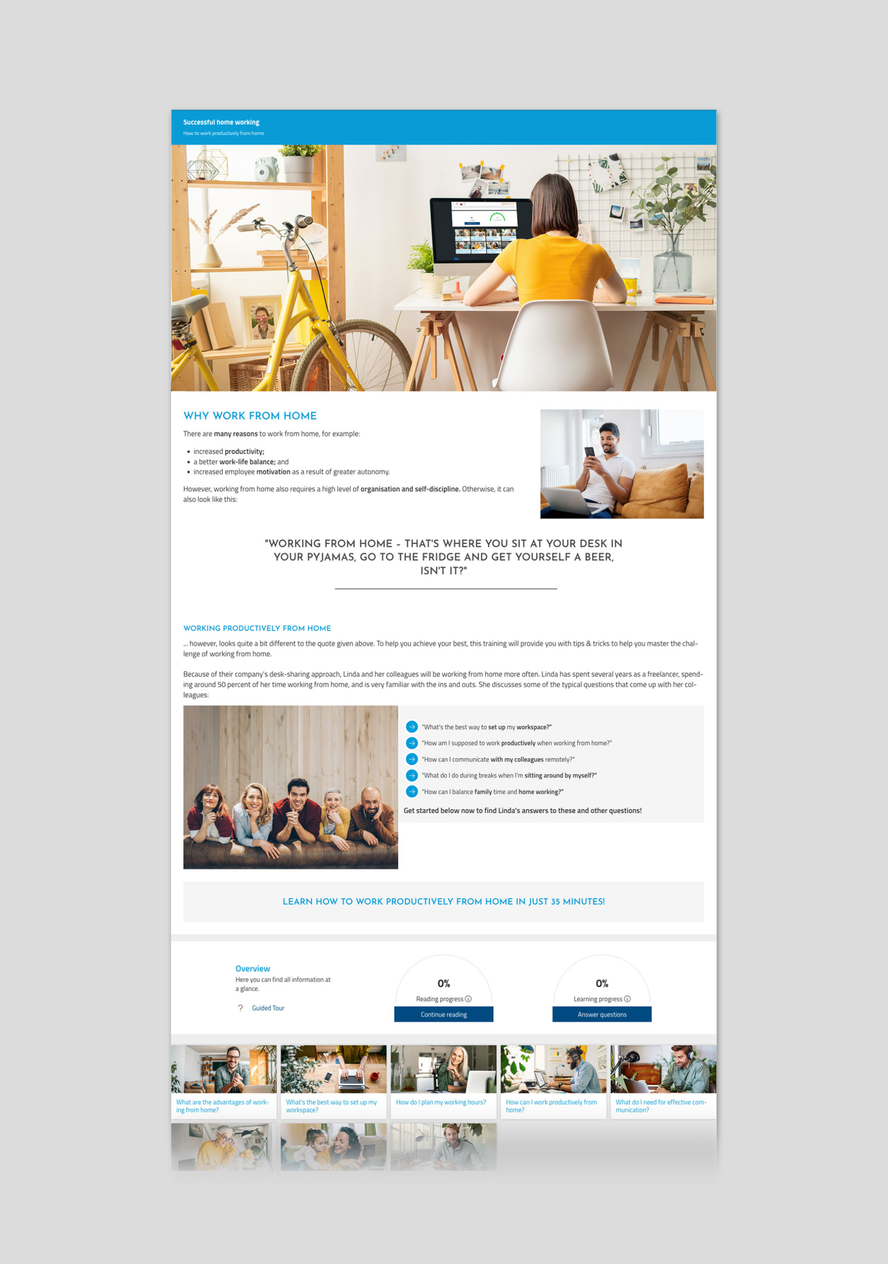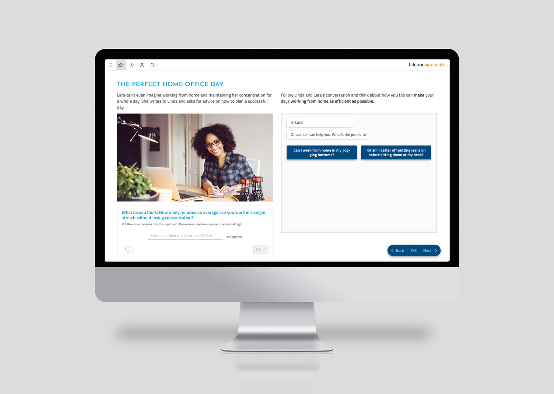 Working from home places particular demands on self-organization. This training course shows how to efficiently structure your working day when working from home and how to increase your own productivity. There are also practical tips on how to stay physically fit and how to organize everyday life with children.