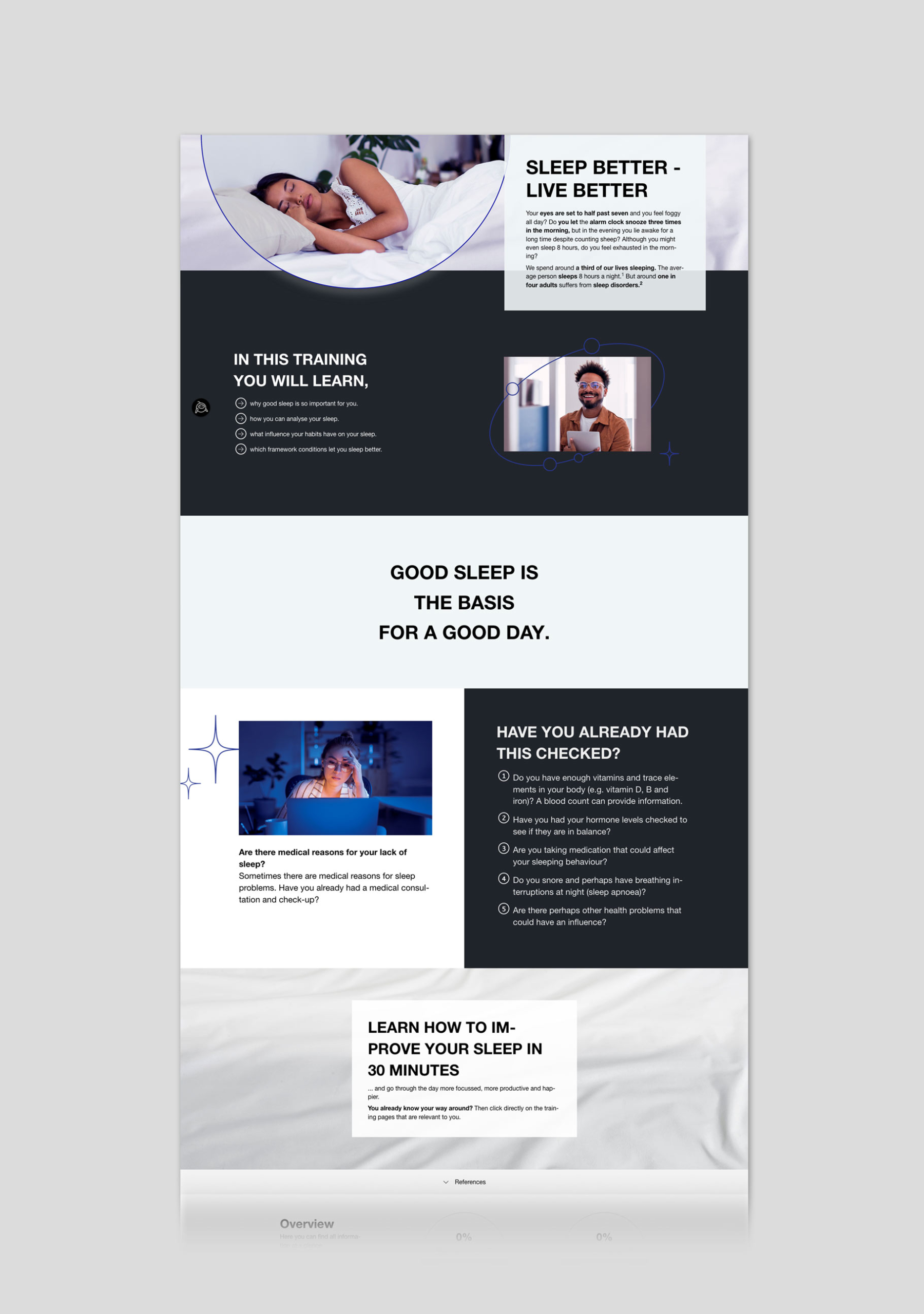 In this training course, your learners will find out why good sleep is so important and should not be underestimated. The aim is not only to increase performance, but also to feel more relaxed and well overall.