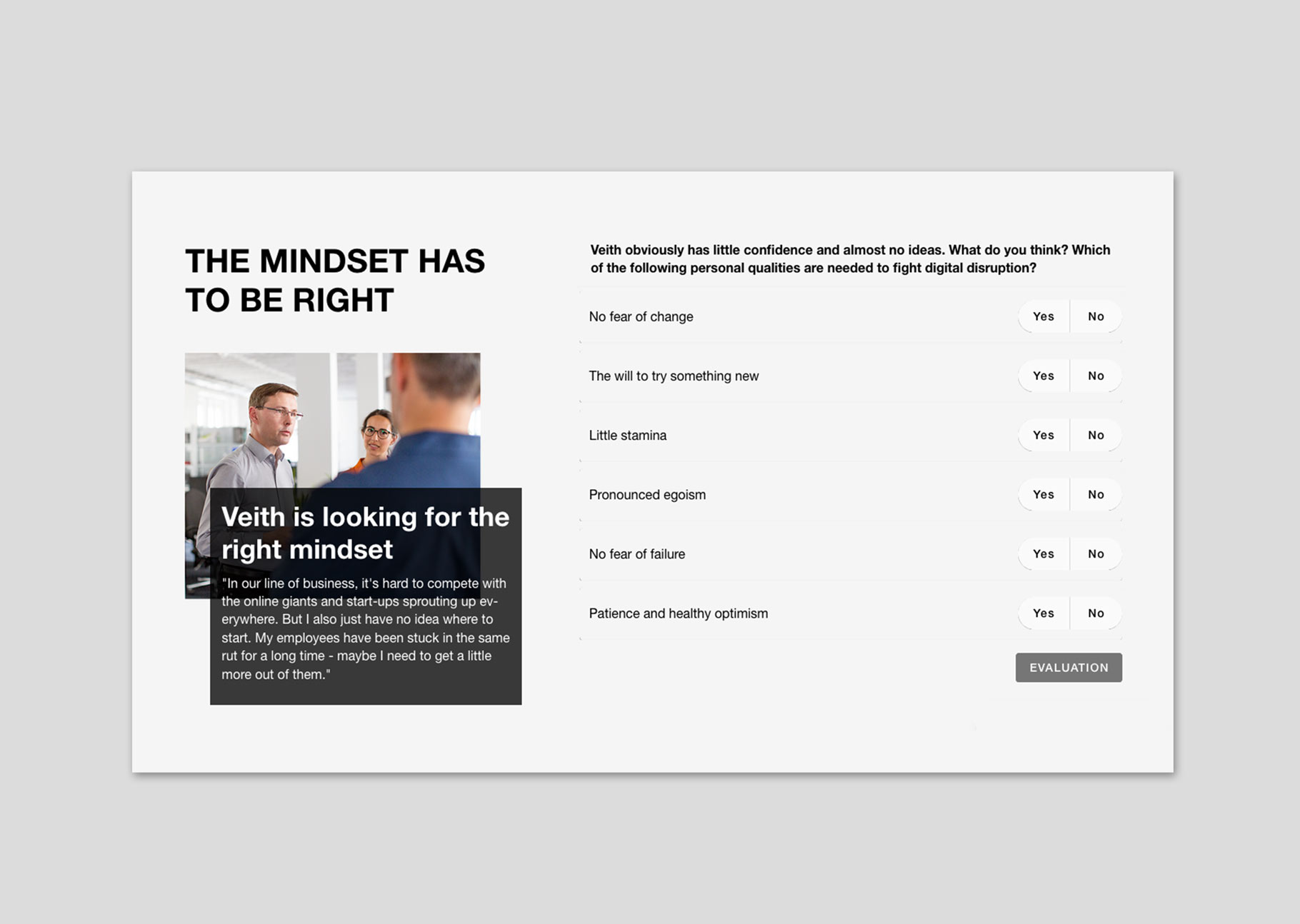 Now that you have looked around the company and spoken to the employees, you suggest to Veith that you put your own digital mindset to the test.