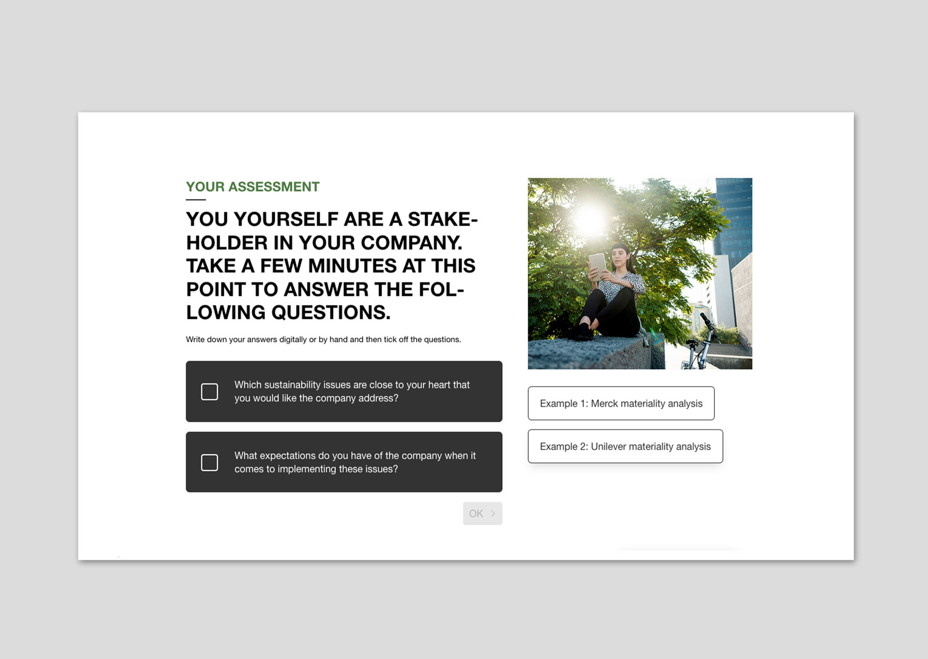 - Identify relevant sustainability goals for your company (materiality analysis).